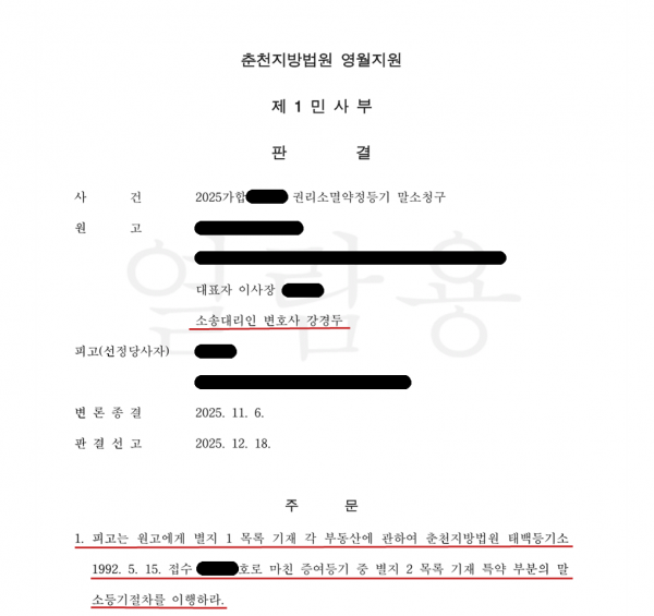 [] [승소 사례] 권리소멸약정등기 말소청구 사건 승소 페이지 정보 최고관리자 작성일25-12-19 목록 본문 브라이튼 법률사무소 강경두 변호사는 최근 권리소멸약정등기 말소청구 사건에서 원고를 대리하여 전부 승소하였습니다. 앞으로도 브라이튼 법률사무소는 의뢰인의 권리 구제를 위해 최선을 다하겠습니다. 목록